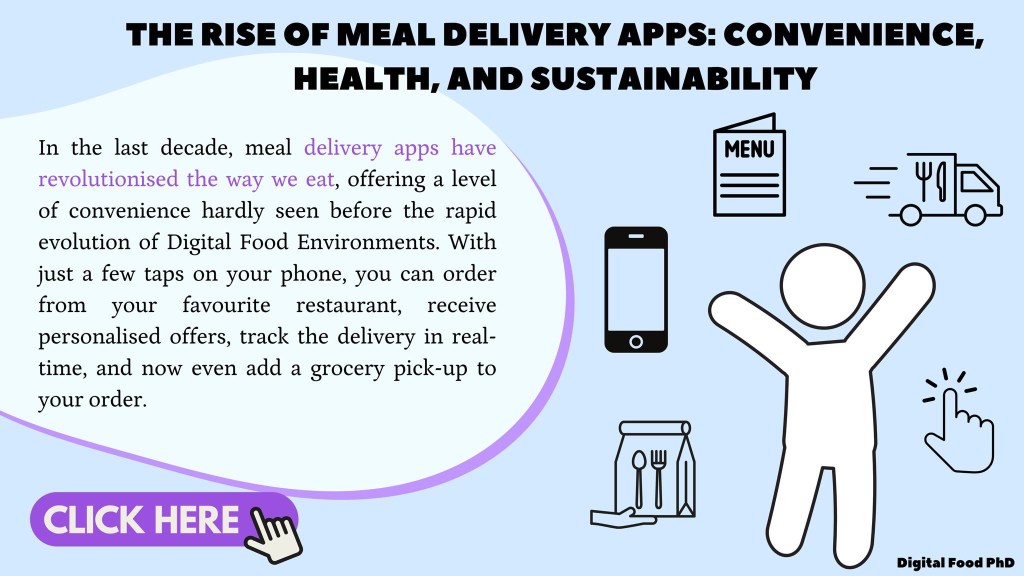 In the last decade, meal delivery apps have revolutionised the way we eat, offering a level of convenience hardly seen before the rapid evolution of Digital Food Environments. With just a few taps on your phone, you can order from your favourite restaurant, receive personalised offers, track the delivery in real-time, and now even add a grocery pick-up to your order. While these apps have provided greater accessibility to meals, their rise has also raised important questions around how they influence consumer behaviour and how such food delivery technologies can be used to enable healthier and more sustainable purchases.